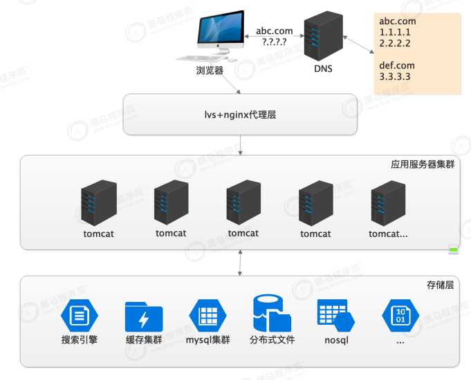 1,DNS轮询:通过配置多个IP将服务部署到多个机房,通过DNS的策略轮询调用,可以实现机房层面的扩容