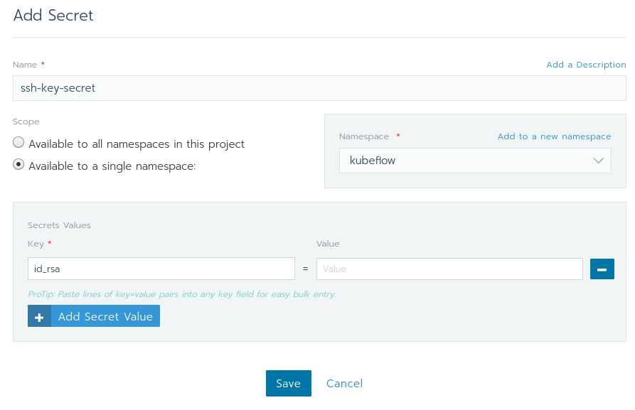 确保Scope仅是个命名空间。如果将Scope设置为所有命名空间,那么将使得在Default项目中的任意工作负载都能够使用你的ssh密钥。