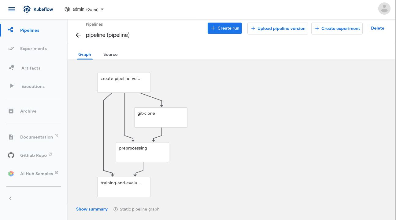 下一页将会展示完整的流水线。我们所看到的是一个流水线的有向无环图,在本例中这意味着依赖项会通往一个方向并且它不包含循环。点击蓝色按钮Create run 以开始训练。