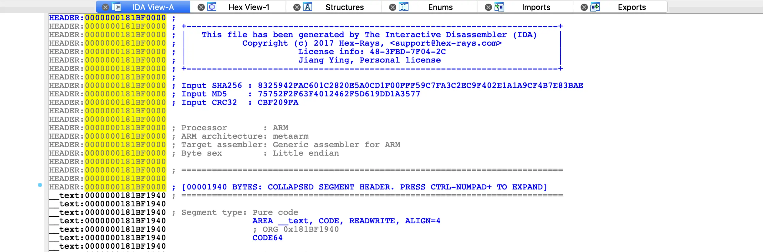 再用IDA查看 CoreFoundation 库的起始地址是0x000000181BF0000:
