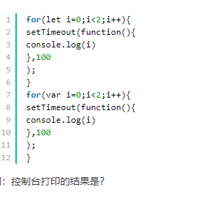 ①Js是单线程的,Settimeout是异步宏任务,所以代码执行遇到异步的,就放在事件队列中的,等线程中的任务执行完后才会执行事件队列中的任务。② let是es6中声明变量的方式,有自己的作用域块,可以放变量,所以let绑定for循环时,每个i都有自己的值. 在这个for循环中就是满足一次条件向事件队列中添加一个打印i的事件,且每个事件中的i有自己的值 ③Var没有作用域块,for循环的变量就会后一个覆盖前一个,当循环完毕时i就只有一个值,又因为for循环的判断条件是不满足跳出,所以i最后是2而不是1 ④这些完了后执行事件队列中的任务,就打印了0122