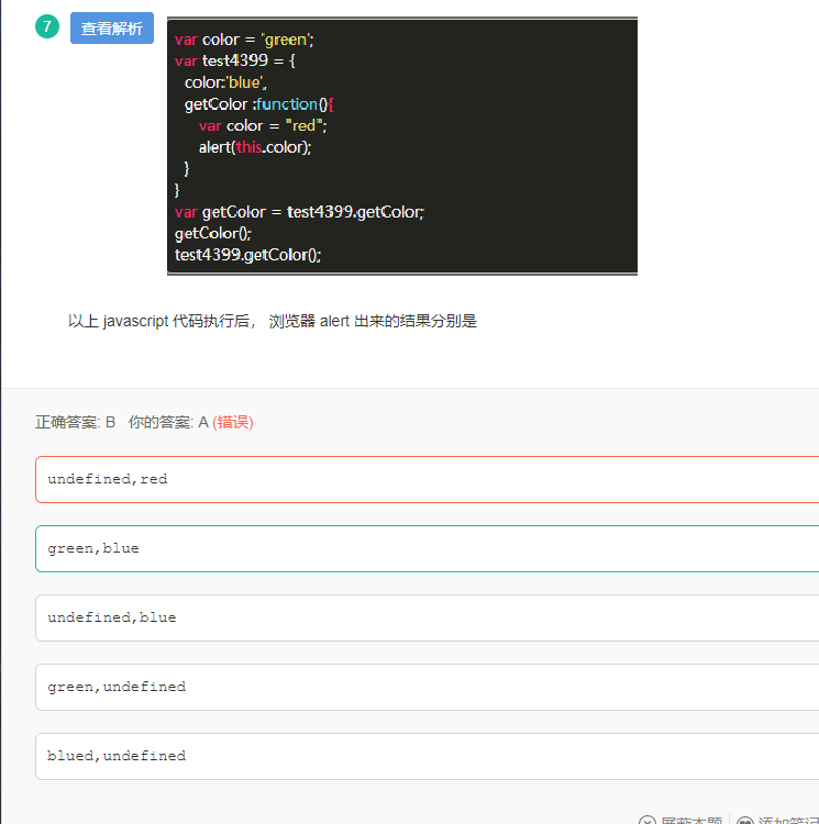getColor();相当于普通的函数调用,此时this指向window,this.color应该为全局变量的值 test4399.getColor();此时this指向调用函数的对象test4399,因此this.color应该为对象的属性值