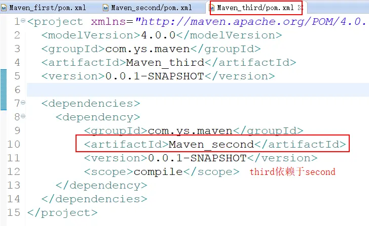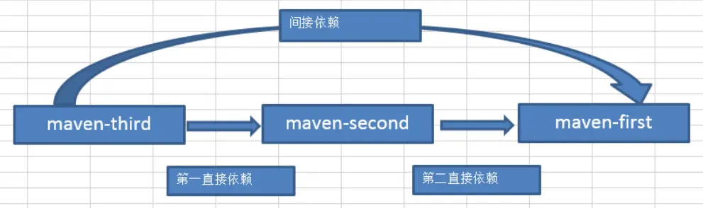 比如我们创建三个Maven 工程,maven-first,maven-second以及maven-third,而third依赖于second,second又依赖于first,那么我们说 second 是 third 的第一直接依赖,first是second的第二直接依赖。而first是third的间接依赖。