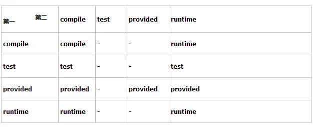 4、当第二直接依赖的范围是runtime的时候,传递性依赖的范围与第一直接依赖的范围一致,但compile例外,此时传递的依赖范围为runtime;
