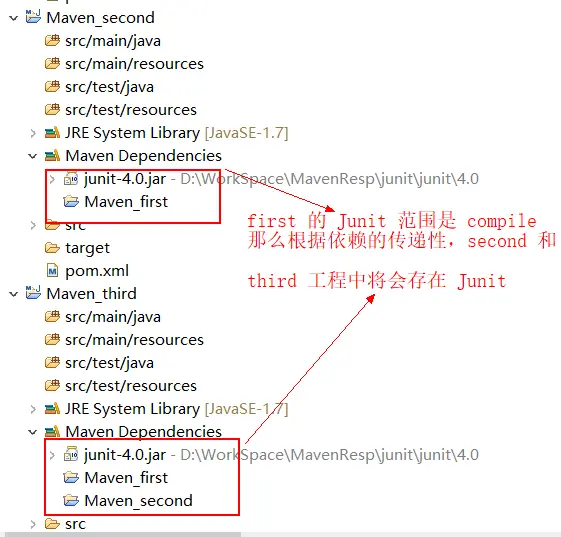 如果我们将 Maven_first 的Junit 改为 compile,那么将会符合上面总结的第一点:当第二依赖的范围是compile的时候,传递性依赖的范围与第一直接依赖的范围一致。