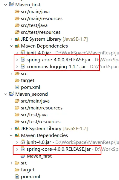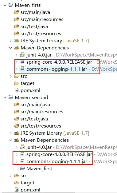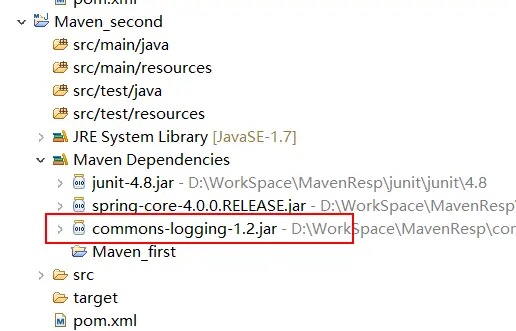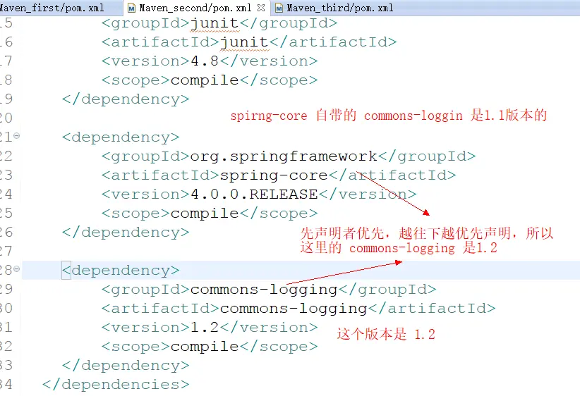 比如:我们在Maven_first 中添加 spring-core,maven 会自动将 commons-logging添加进来,那么由于 Maven_second 是依赖 Maven_first 的,那么 Maven_second 中将存在 spring-core(自带了commons-logging),这时候我们不想要 commons-logging,那该怎么办呢?我们上面第二大点提到了: