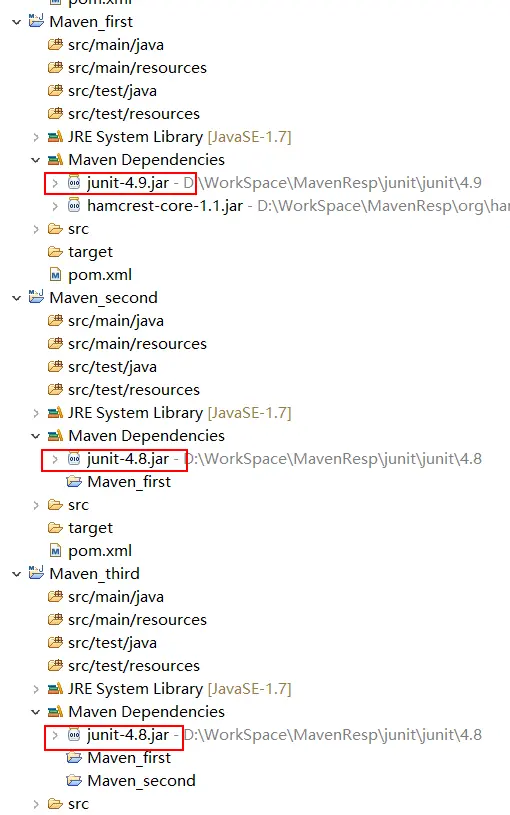 ①、跨 pom 文件,路径最短者优先。比如我们在 Maven_first 中的 Junit 是4.9版本的,Maven_second 中的 Junit 是4.8版本的,那么Maven_third 中的 Junit 将会是那个版本呢?