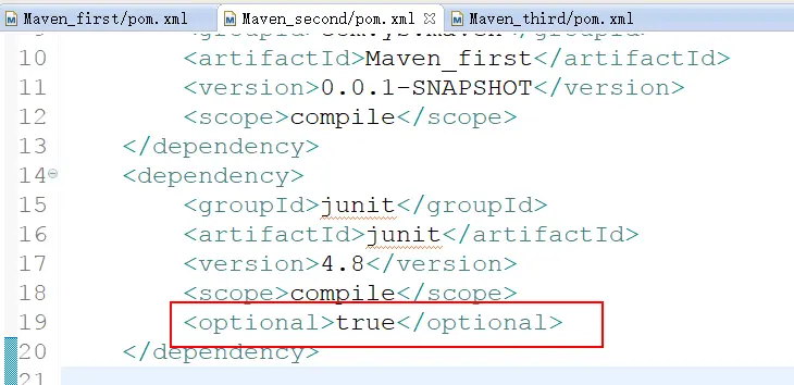 Optional标签标示该依赖是否可选,默认是false。可以理解为,如果为true,则表示该依赖不会传递下去,如果为false,则会传递下去。