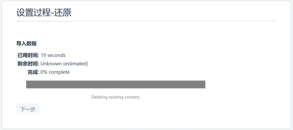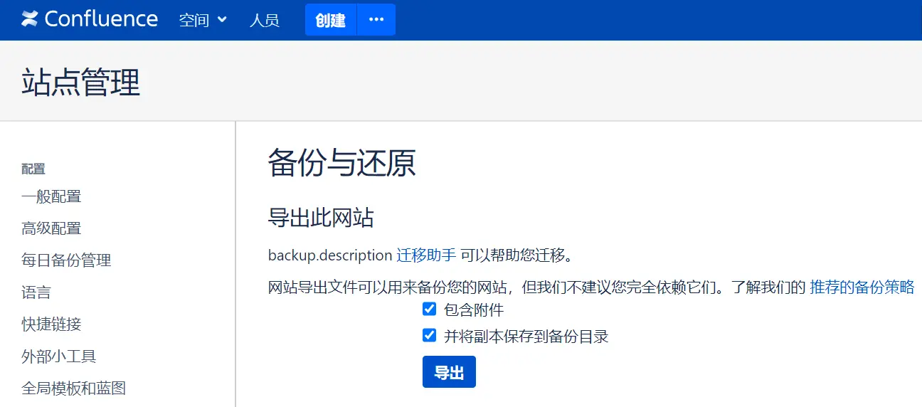 - 使用管理员账号进入 站点管理 -> 一般配置 -> 备份与还原,对当前 confluence 进行备份操作