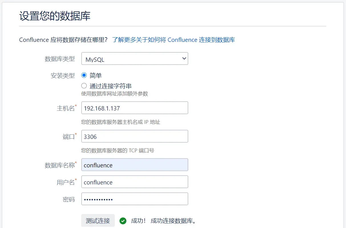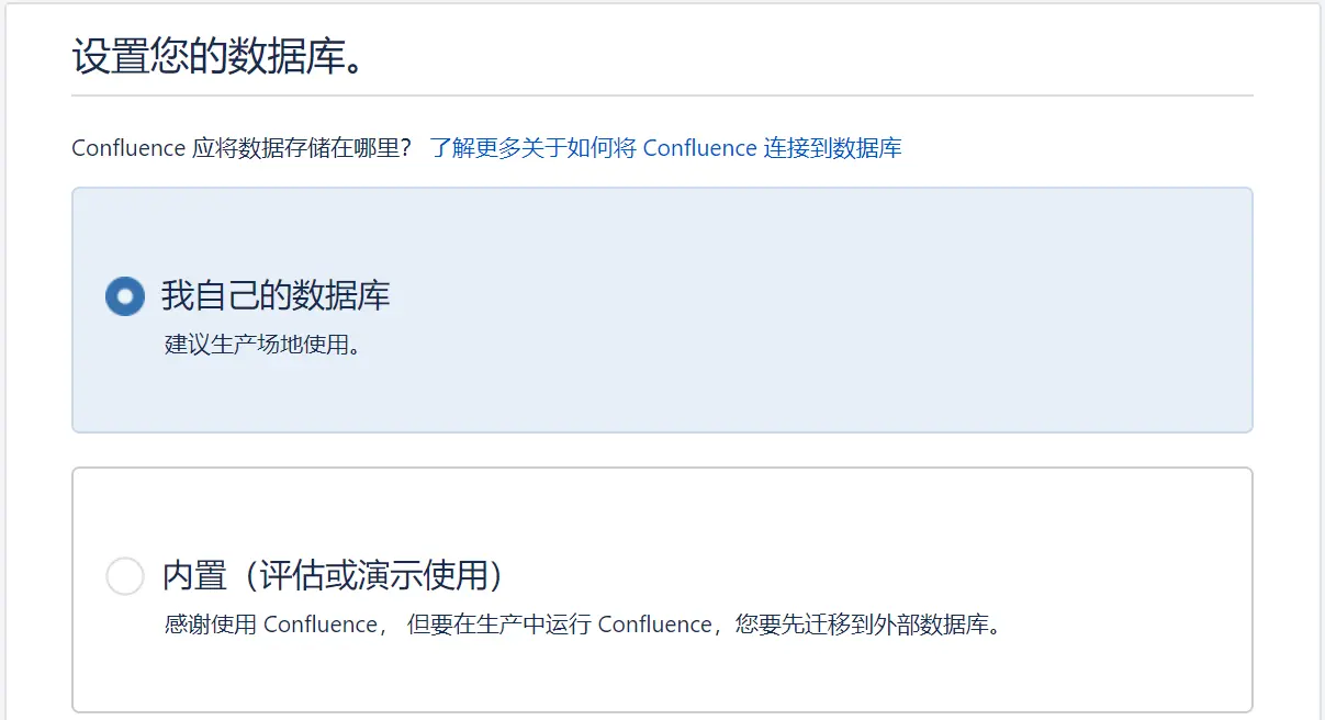 docker run -d -v /data/conflunece:/var/atlassian/confluence --name confluence -p 8090:8090 --user root:root cptactionhank/atlassian-confluence:latest - 选择使用非内置数据库