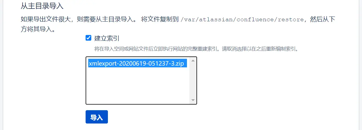 docker cp 8172e44b0b61:/var/atlassian/confluence/backups/xmlexport-20200619-051237-3.zip /home/confluence命令将站点备份文件从容器中拷贝至主机目录下