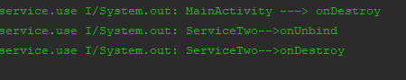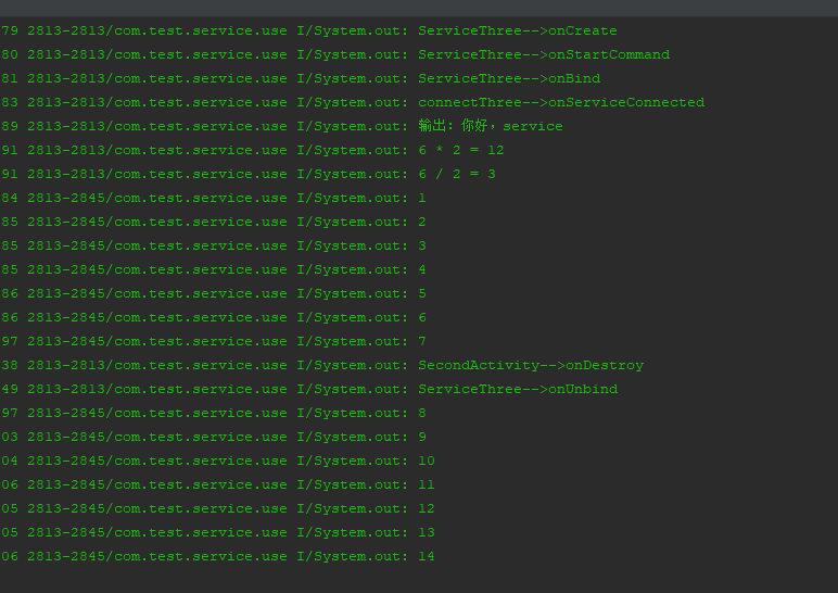 注释掉上面代码中onCreate的if判断,使得可以一直打印计数,当退回到桌面,或者按下返回键销毁Activity后,如果此时app没有被系统完全回收,可以看到后台服务任然会一直打印输出。这就说明以startService方式启动的服务,可以脱离当前Activity,甚至可以"脱离"当前应用,只要系统允许,可以在后台无限运行下去。