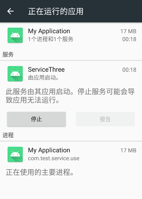 在开发者选项中查看正在运行的服务,就可以看到我们的ServiceOne服务还在后台运行着。