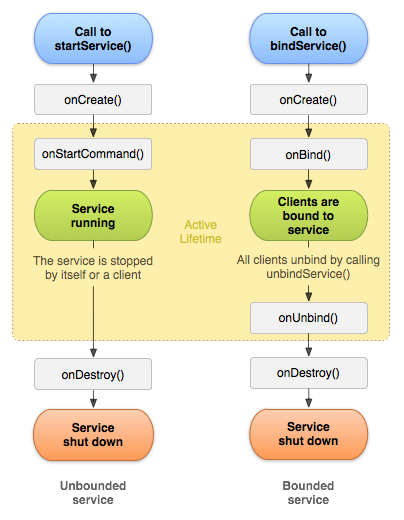 startService、bindService,从上图中我们可以看出,通过这两种不同的方式启动service,他们的生命周期方法会有一些不同。通过startService启动,会回调onStartCommand方法;通过bindService启动,会回调onBind方法。