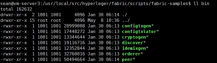bin目录中包含7个可执行程序,当fabric网络启动时将被调用。