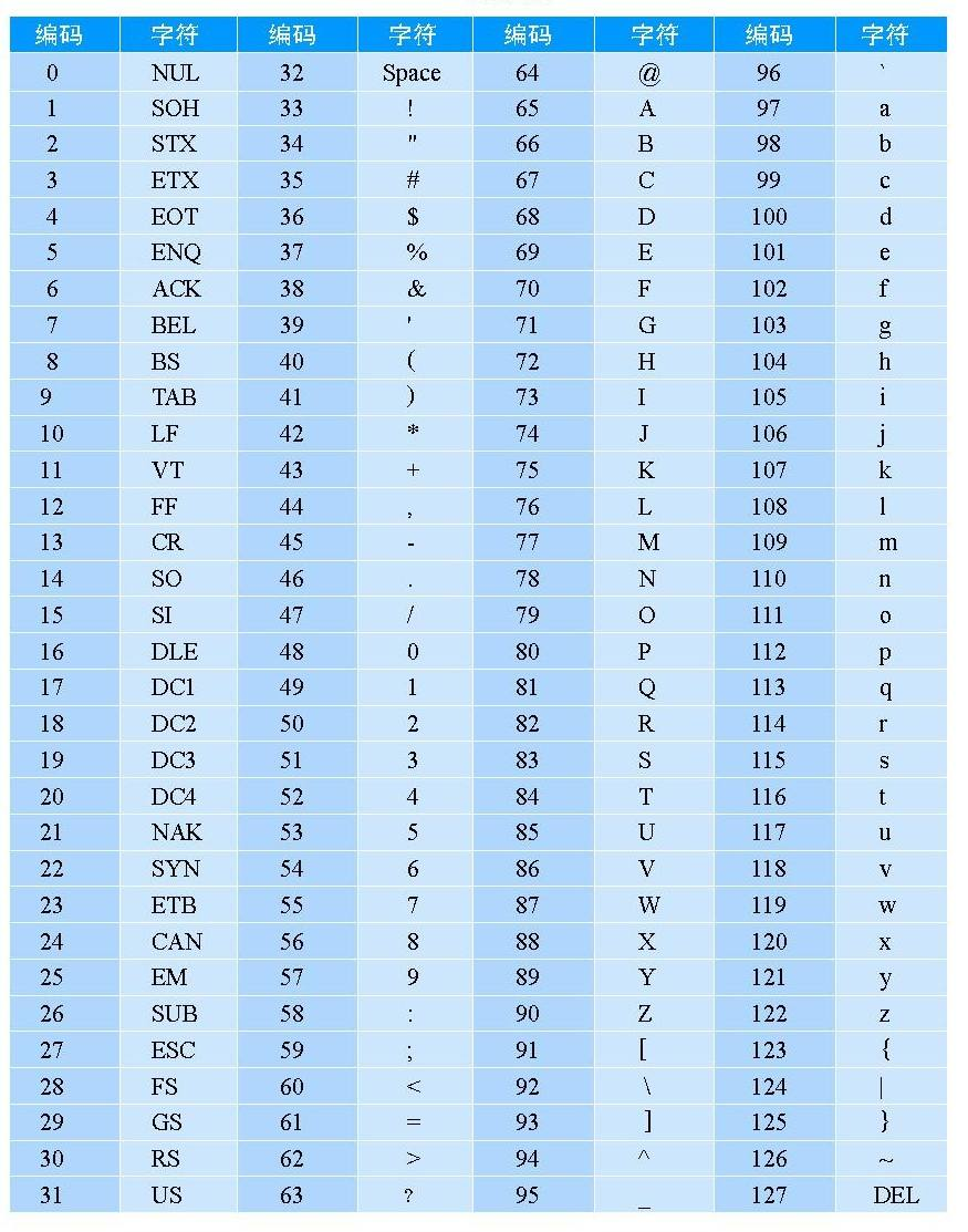 其中32-126我们可以在键盘上敲出。对于ASCII码我们只需记住A为65,a为97,这样可以推出其余字母。