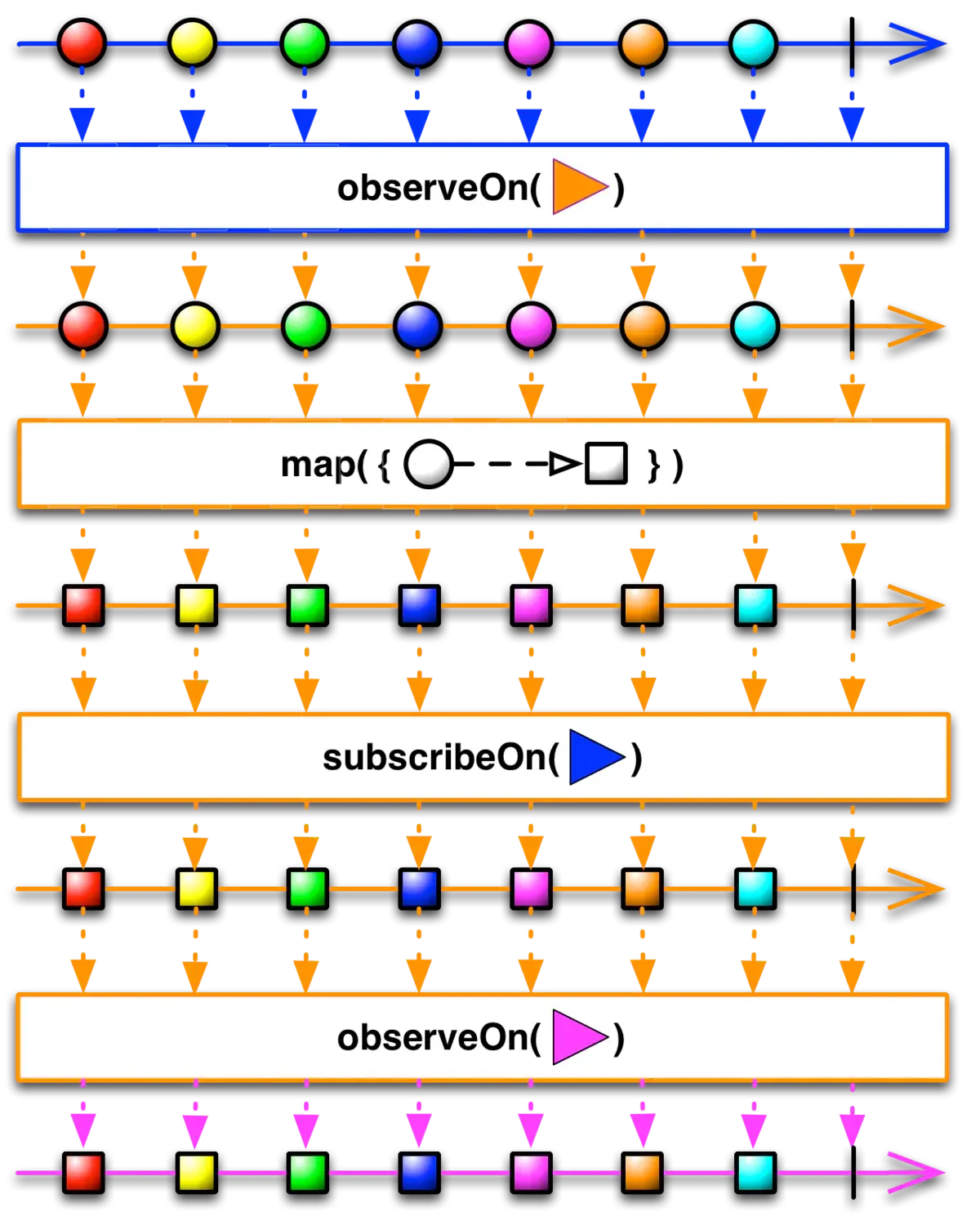 在默认情况下,RxJava只在当前线程中运行,它是单线程的。此时Observable用于发射数据流,Observer用于接收和响应数据流,各种操作符(Operators)用于加工数据流,它们都在同一个线程中运行,实现出来的是一个同步的函数响应式。然而,函数响应式的实际应用是大部分操作都在后台处理,前台响应的一个过程。所以需要对刚才的流程做一下修改,改成Observable生成发射数据流,Operators加工数据流在后台线程中进行,Observer在前台线程中接受并响应数据。 此时会涉及使用多线程来操作RxJava,可以使用RxJava的调度器(Scheduler)来实现。