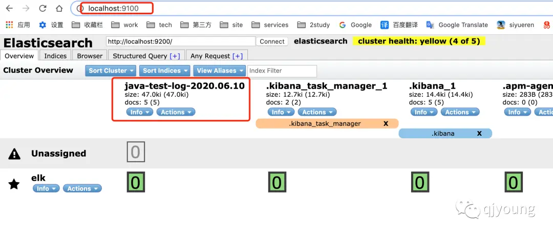 当然你启动成功之后是没有 java-test-log-* 这个索引的。