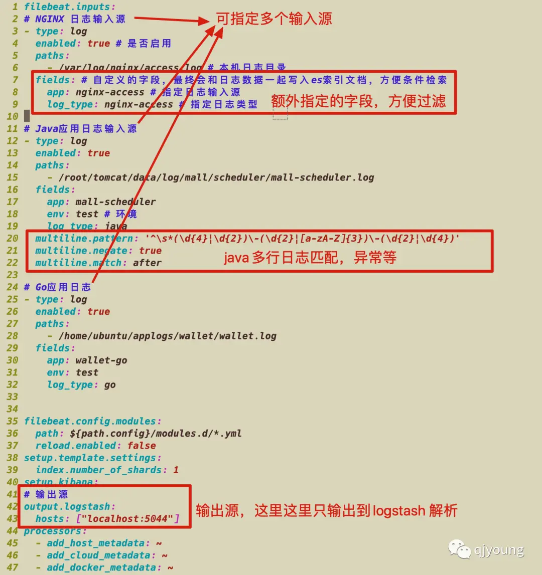 如图是我的配置,通过filebeat 自定义的field-log_type 来区分日志来源。