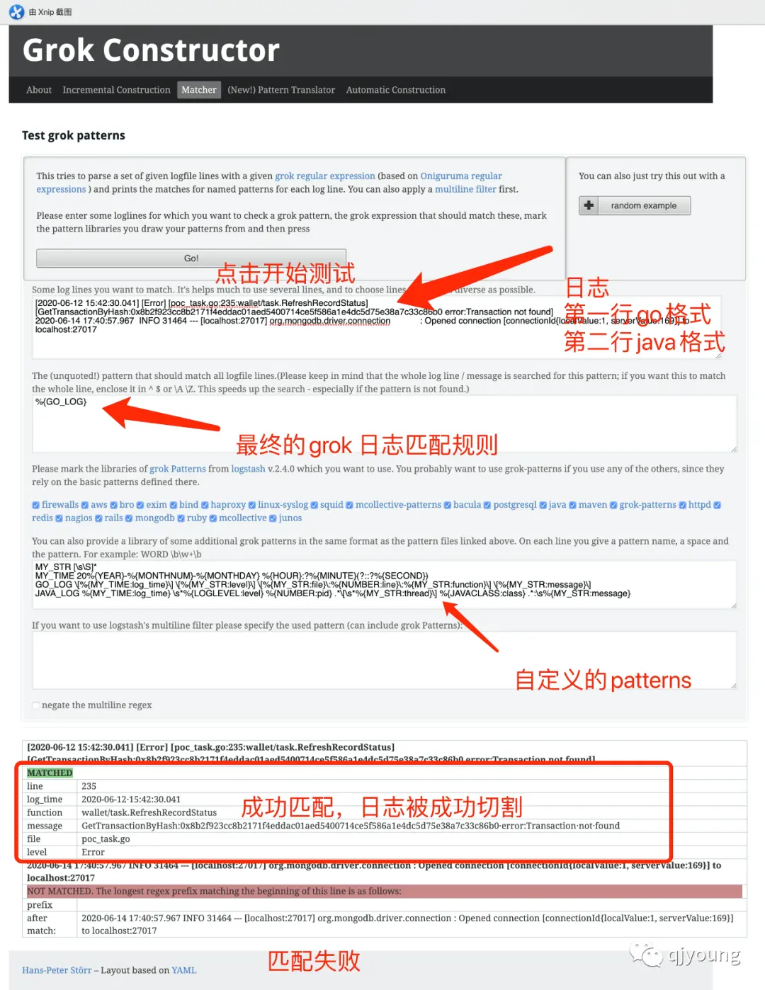grok作用简单来说就是通过正则匹配来切割日志,将日志切割成不同部分。grok插件内置了一些常用的patterns,比如说日期时间、ip等