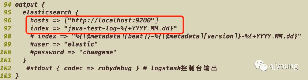 配置输出源,这里只配置了es,并指定将日志数据按天存到不同索引,方便日后处理过期日志。