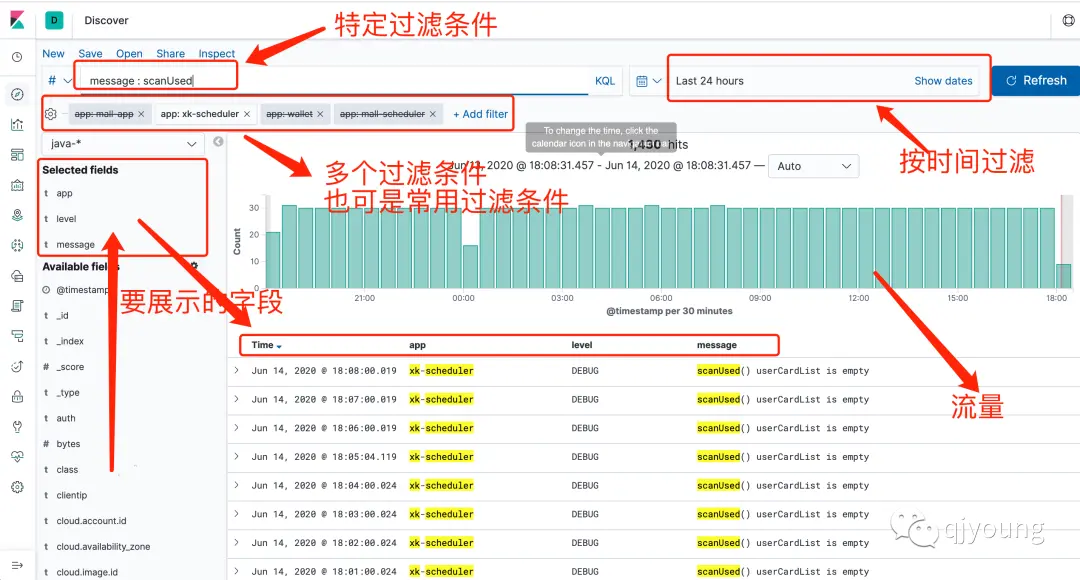 使用kibana简单的查询如下图,入口统一,简单方便快速简直不要太友好,与传统用tail、greo 等命令查看纯文本日志相比,就像是使用iphone与诺基亚的区别