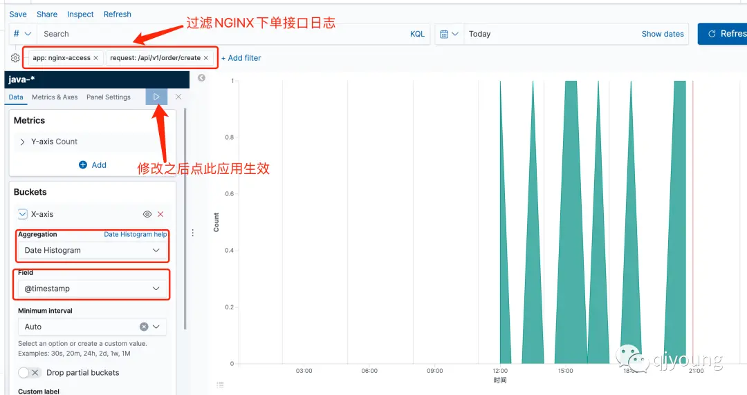 选择好类型,kibana默认会生成y轴,默认指示数量 count
