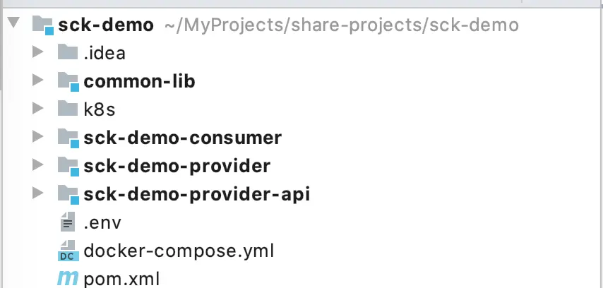 common-lib:通用组件,如全局统一异常处理、自定义参数校验注解、json解析等工具类、api响应以及响应状态码的定义等;k8s:该目录存储本地部署到minikube搭建的单节点kubernetes集群的yaml文件;sck-demo-provider-api:定义对外提供的接口,只是方便java语言开发的应用直接通过依赖该jar包调用,实现rpc远程进程调用;sck-demo-provider:服务提供者,实现对外的接口;sck-demo-consimer:服务消费者,依赖sck-demo-provider-api模块,调用sck-demo-provider暴露的接口;