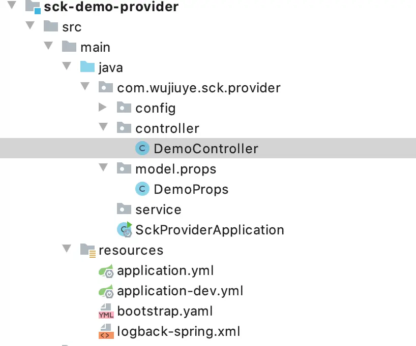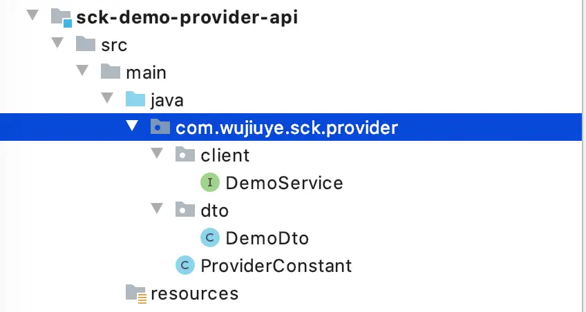 该模块定义sck-demo-provider服务提供给其它服务调用的接口,也是sck-demo-provider需要实现的接口。但这里的实现接口不是像dubbo那样,需要在service或者controller通过关键字implements实现接口,如果非要比喻的话,倒像是go语言中的接口定义与实现。