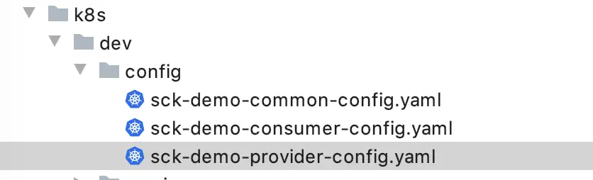 等到将服务部署到k8s集群时,需要使用kubectl apply -f sck-demo-provider-config.yaml将在k8s中创建该ConfigMap资源。线上的配置文件就不要放在项目中了。