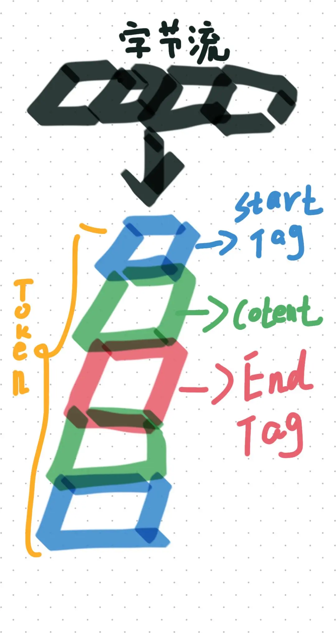 V8 编译 JavaScript 过程中的第一步是做词法分析,将 JavaScript 先分解为一个个 Token。解析 HTML 也是一样的,需要通过分词器先将字节流转换为一个个 Token,分为 Tag Token 和文本 Token,下面是一个token的组成结构。