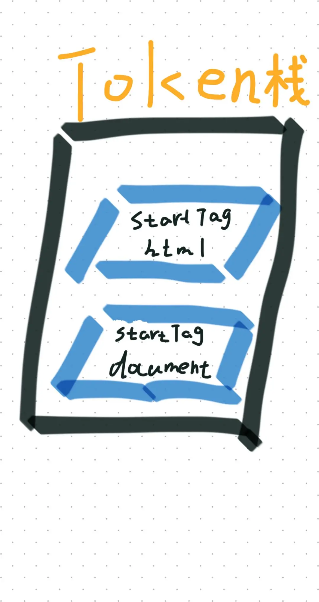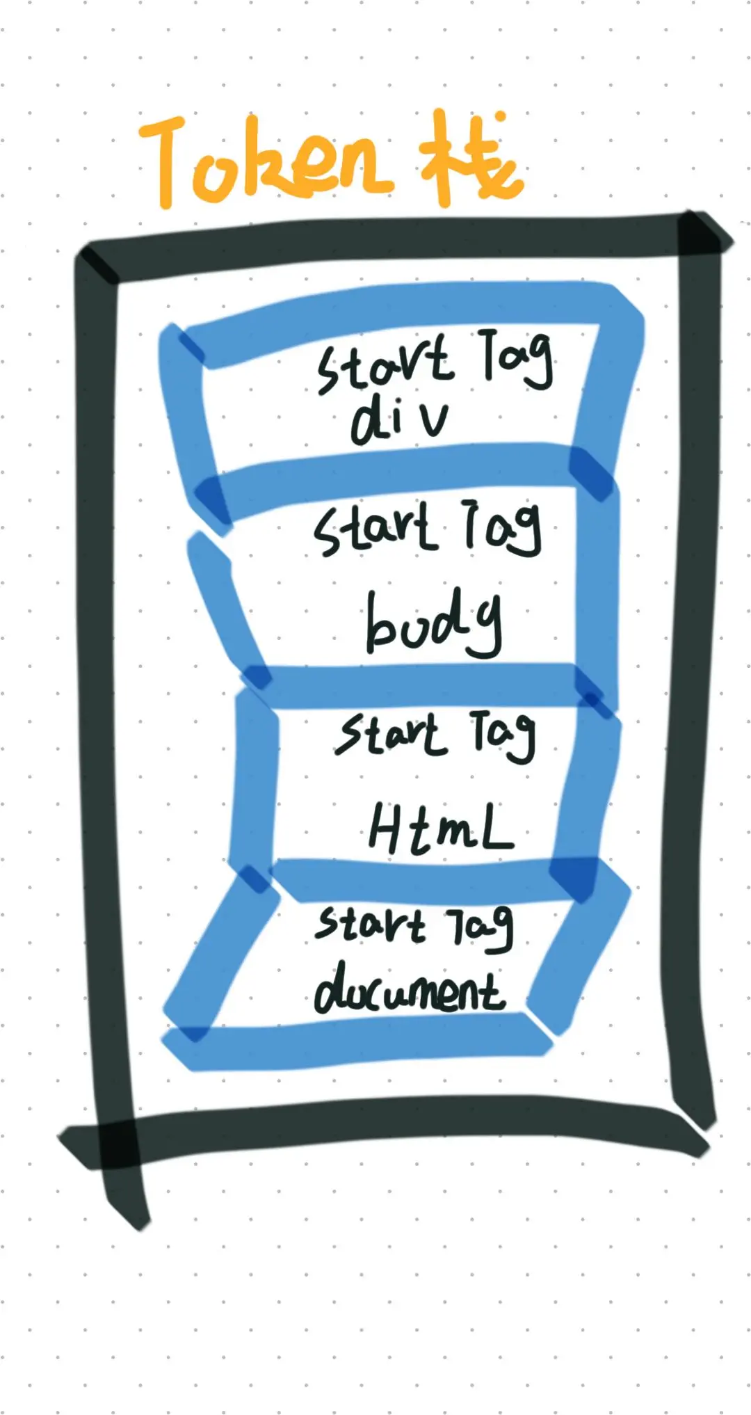 在这里HTML解析器维持着一个TOKEN栈结构,这个栈会对应着DOM的节点。如果我们有如下代码: