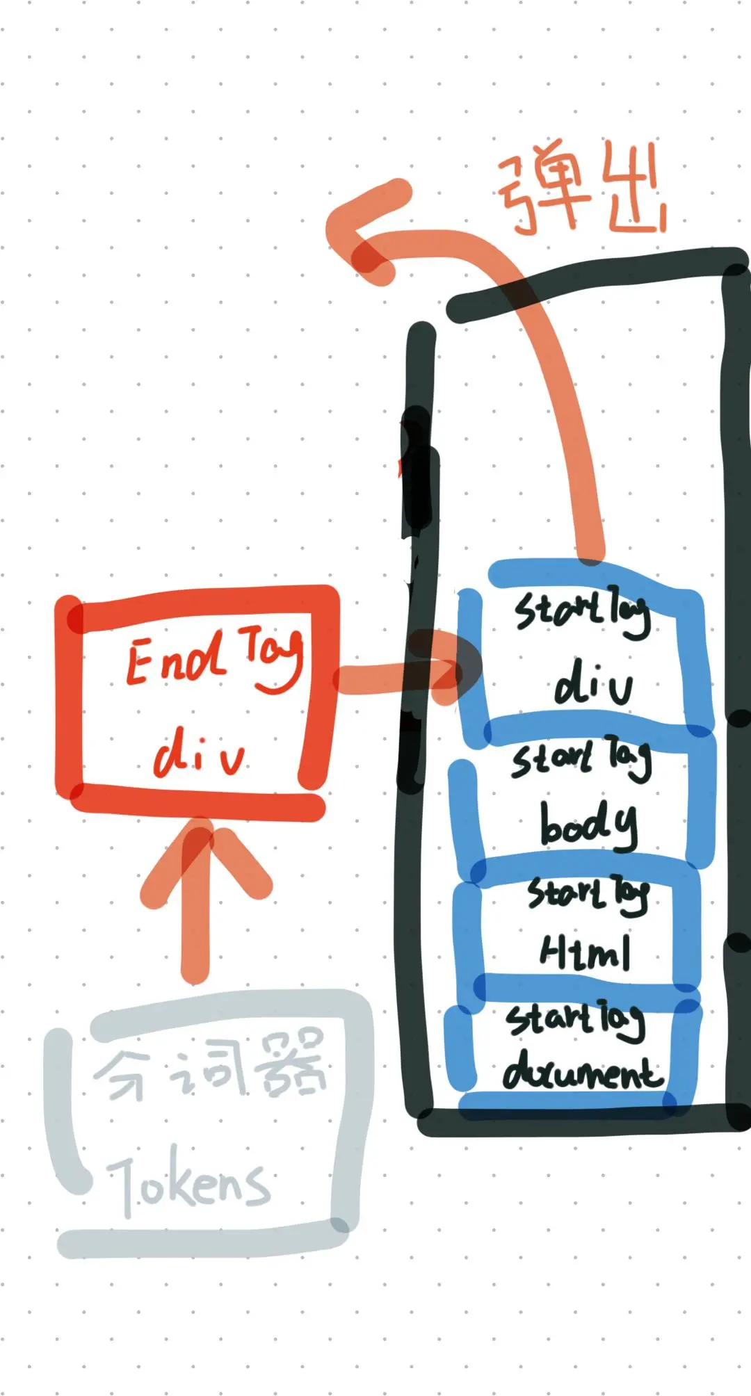 再接下来,分词器解析出来第一个 EndTag div,这时候 HTML 解析器会去判断当前栈顶的元素是否是 StartTag div,如果是则从栈顶弹出 StartTag div,