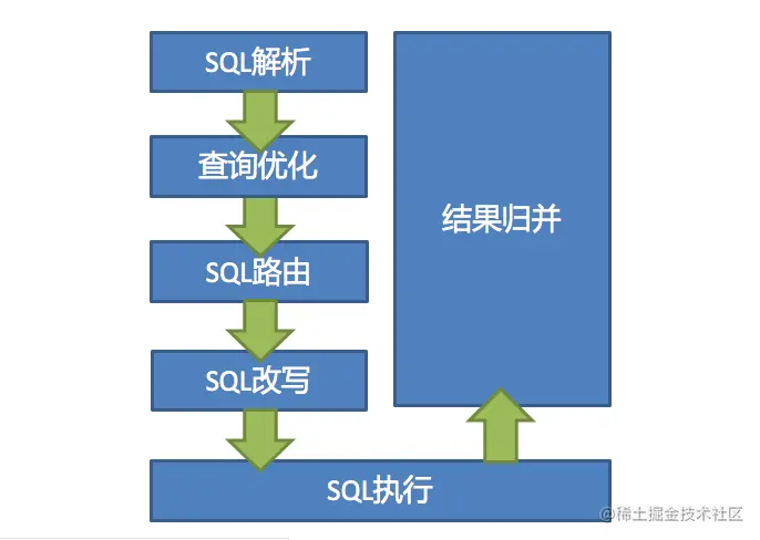 SQL解析 => 执行器优化 => SQL路由 => SQL改写 => SQL执行 => 结果归并
