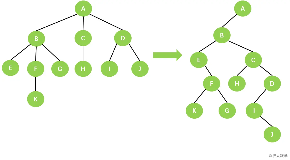- 「在二叉树中,某个结点的左孩子」对应「在原树中,该结点的第一个孩子」。
