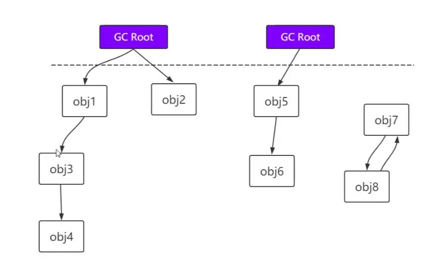通过GC Root的对象,开始向下寻找,看某个对象是否可达 GC root遍历不可达的就是垃圾。