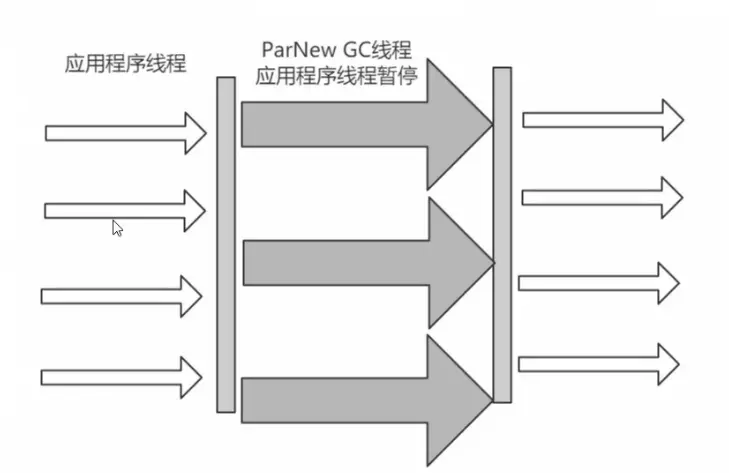 - 多条垃圾收集线程并行工作,但此时用户线程仍然处于等待状态。