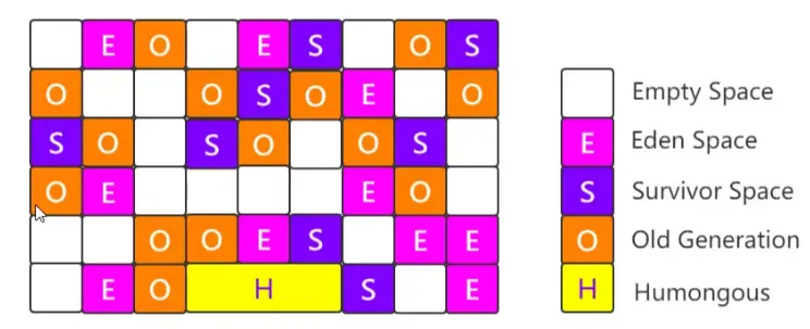 G1的内存结构和传统的内存空间划分有比较的不同。G1将内存划分成了多个大小相等的Region(默认是512K),Region逻辑上连续,物理内存地址不连续。同时每个Region被标记成E、S、O、H,分别表示Eden、Survivor、Old、Humongous。其中E、S属于年轻代,O与H属于老年代。 示意图如下: