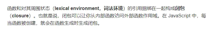 在 JavaScript 中,根据词法作用域的规则,内部函数总是可以访问其外部函数中声明的变量,当通过调用一个外部函数返回一个内部函数后,即使该外部函数已经执行结束了,但是内部函数引用外部函数的变量依然保存在内存中,我们就把这些变量的集合称为闭包。