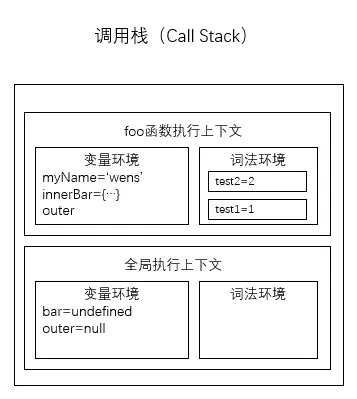 根据词法作用域的规则,内部函数 getName 和 setName 总是可以访问它们的外部函数 foo 中的变量,所以当 innerBar 对象返回给全局变量 bar 时,虽然 foo 函数已经执行结束,但是 getName 和 setName 函数依然可以使用 foo 函数中的变量 myName 和 test1。 所以当 foo 函数执行完成之后,其整个调用栈的状态如下图所示: