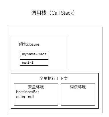 当代码执行到第14行 return innerBar 的时候,我来告诉大家 innerBar 就是一个闭包。别慌,我们来画一下这个时刻的调用栈,相信前面的文章都学会的同学也一定能画的出来