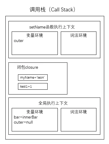 那这些闭包是如何使用的呢?当执行到 bar.setName("leon") 这句代码时,JavaScript 引擎会沿着“当前执行上下文–>foo 函数闭包–> 全局执行上下文”的顺序来查找 myName 变量,像下图一样: