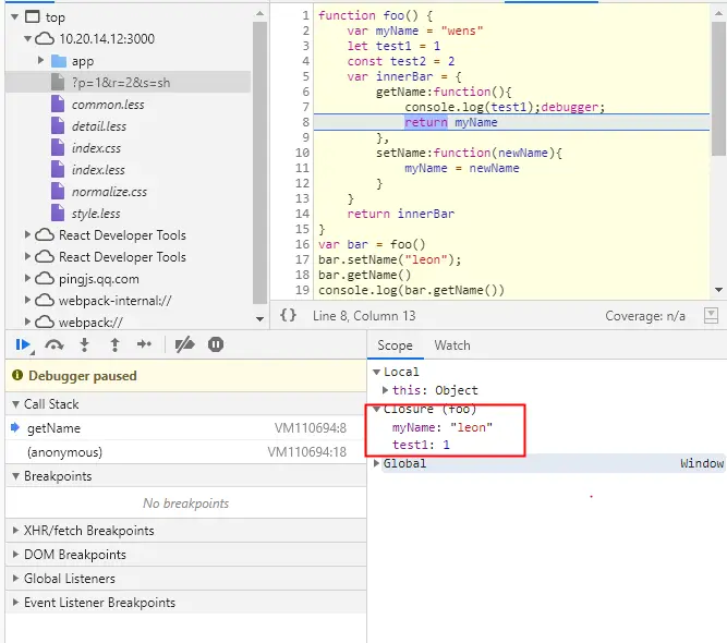 从图中可以看出来,当调用 bar.getName 的时候,右边 Scope 项就体现出了作用域链的情况:Local 就是当前的 getName 函数的作用域,Closure(foo) 是指 foo 函数的闭包,最下面的 Global 就是指全局作用域,从“Local–>Closure(foo)–>Global”就是一个完整的作用域链。