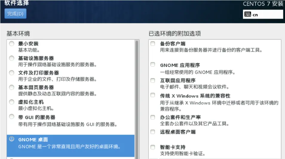 6、点击 软件选择 - 选中 GNOME桌面 - 点击 完成