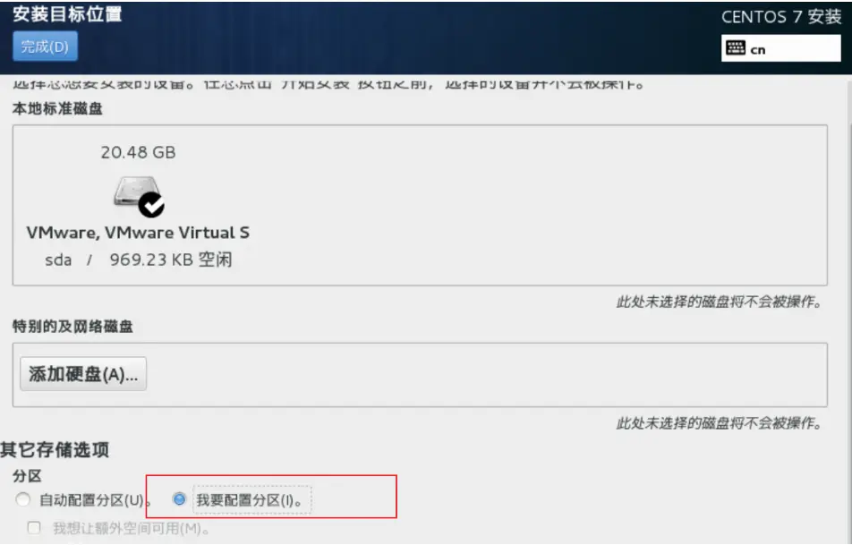 7、点击 安装位置 - 选中 我要配置分区 - 点击 完成