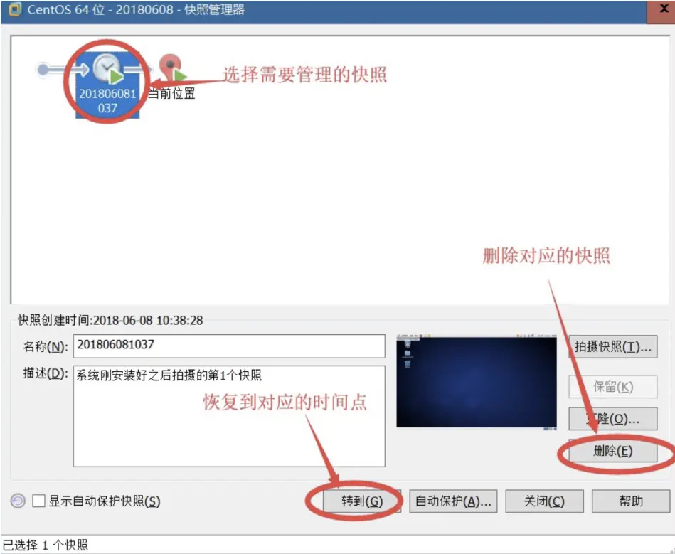 第⼆步:对于快照进⾏行行管理理(恢复、删除)