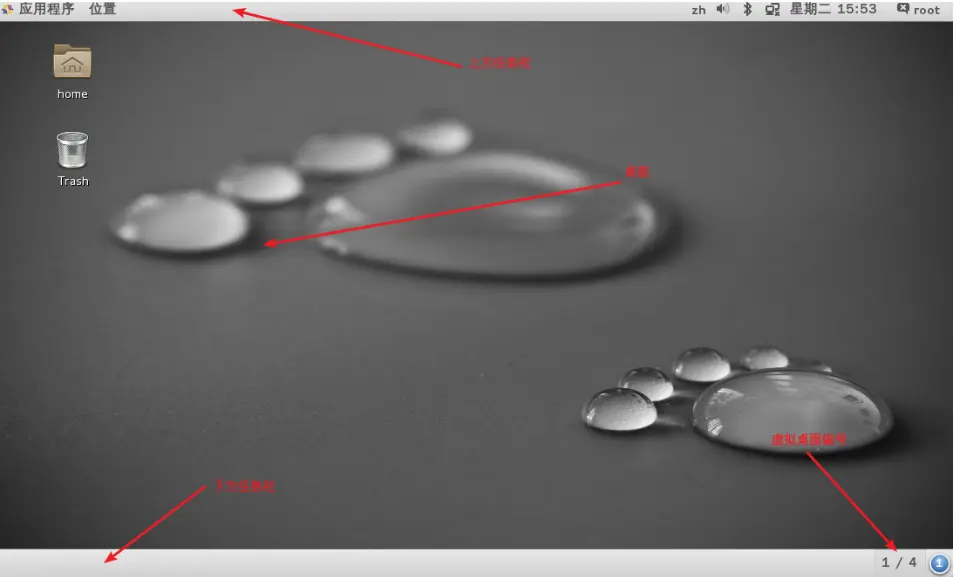 下方任务栏1/4代表多个可用的虚拟桌面,代表共有4个虚拟桌面,目前在第一个