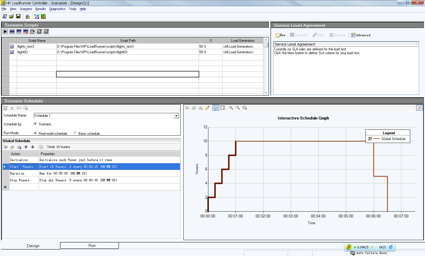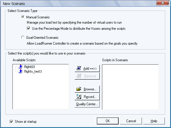 手动场景设置我们可以设置不同的业务组 用户数量,同时编辑计划指定相关的运行时刻,虚拟用户加载策略等完成场景设计工作。在创建脚本的过程中若选择了“Use the Percentage Mode to distribute the Vusers among the scripts”选项,则可以指定虚拟用户总体数量,而后针对每个业务组设置用户数百分比的形式完成场景设置。