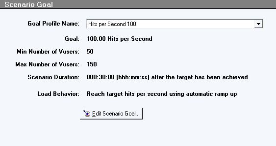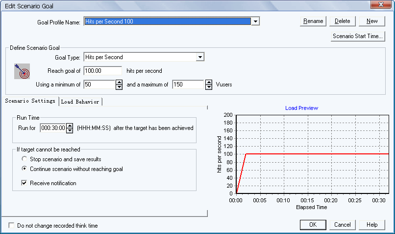 面向目标场景则与人工场景有所不同,它预先定义了一个测试目标,Load Runner将根据这个目标自动构建场景,有点类似向导模式。这种方法对于验证在项目性能说明书中列出、需要达到的性能目标很方便。还是用赛车游戏来比喻,面向目标场景有点类似计时赛或者追逐赛,不同的汽车从同一起点出发,在规定的时间内,走的最远者获胜。