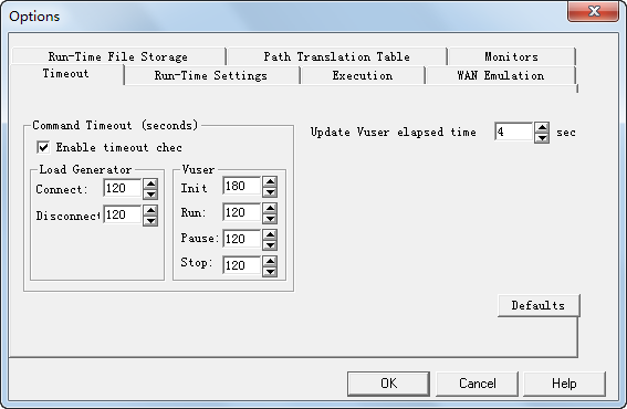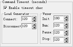 ① 可选框Enable timeout checks为允许超时设置,如果禁用超时限制,Load Runner将无限长地等待负载生成器进行连接和断开连接,并等待其执行“初始化”、“运行”、“暂停”和“停止”命令。